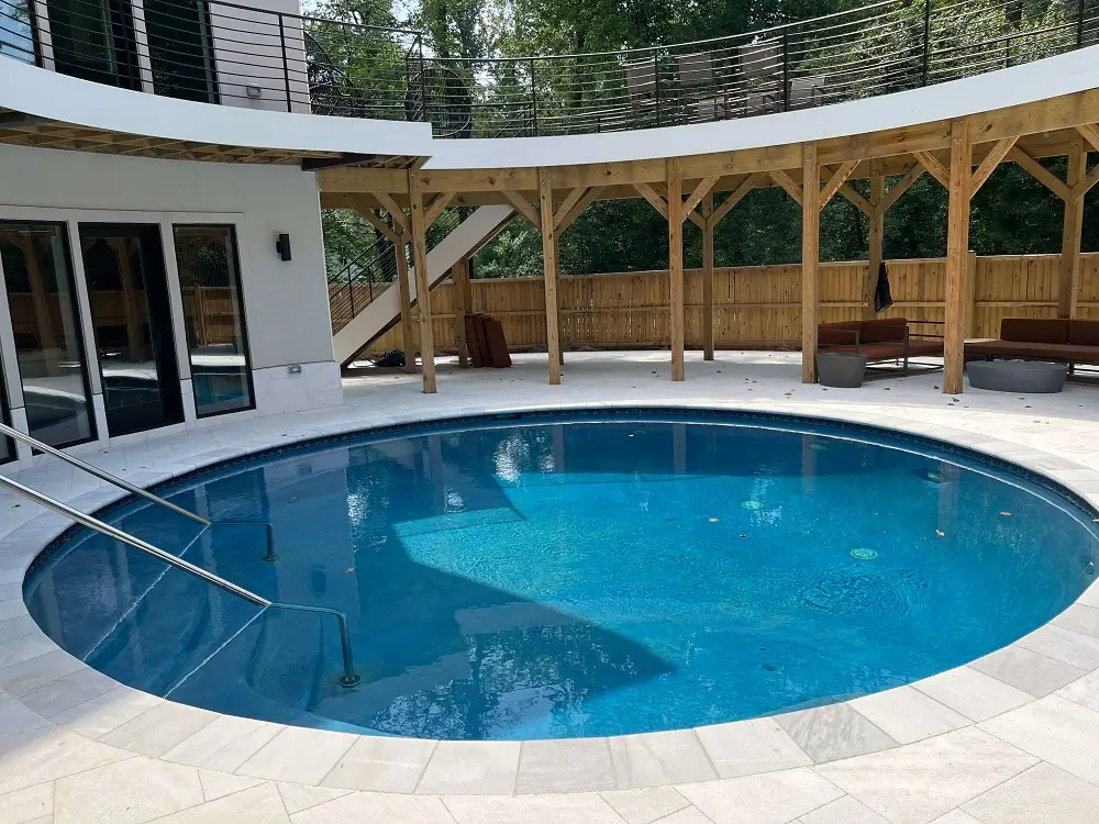 Swimming Pool, Pool Cover, Relaxing Spa, Cascading Waterfalls, A Spacious Poolside Patio, A Circular Paver Patio Project by Atlas General Contractors – Centreville, VA